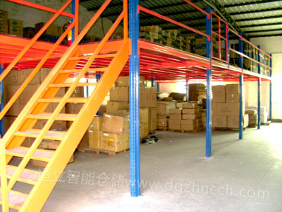 阁楼式货架是用货架做楼面支撑,可设计成多层(通常2-3层),设置有楼梯和液压升降机等,适用于库房较高,货物较小,人工存取。储货量大而且重,另可根据底部存货需求,以承载立柱支撑楼面,设计成钢结构平台。