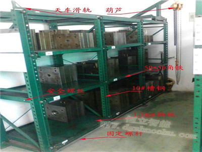 模具架主要用于存放各类模具物品,一般可分为标准型模具架和重型模具架。顶部可配置移动式葫芦小行车,以方便起吊模具。