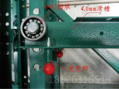 3、材质:立柱采用10#槽钢加厚;立柱拉杆为25*25mm方通;抽板支架采用80*40扁通;面板为2.5mm厚钢板;滑槽为6.0mm厚钢板折弯;轴承采用进口6404型。